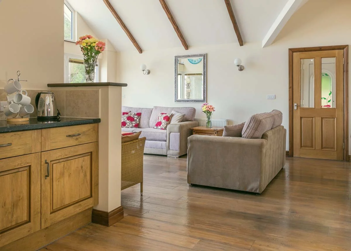 The living area has high ceilings, exposed beams and oak floors. You can hunker down on the two large sofas and take in the uninterrupted coastal views through the floor-to-ceiling glass windows or watch TV. Cosy up around the gas-fired wood-burning-effect stove if summer evenings are a little chilly or you just want to cwtch up on winter days. Make yourself a tea or coffee in the additional mini-kitchen area just at hand.
